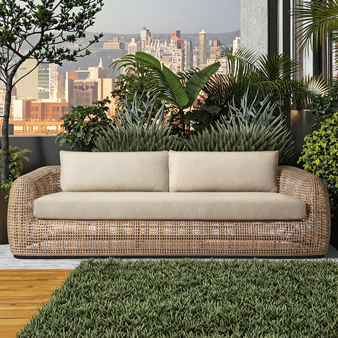 โซฟากลางแจ้งทันสมัยพร้อมที่นั่งหุ้มเบาะที่ยืดหยุ่นและโครงหวายธรรมชาติเหมาะสำหรับโซฟากลางแจ้ง